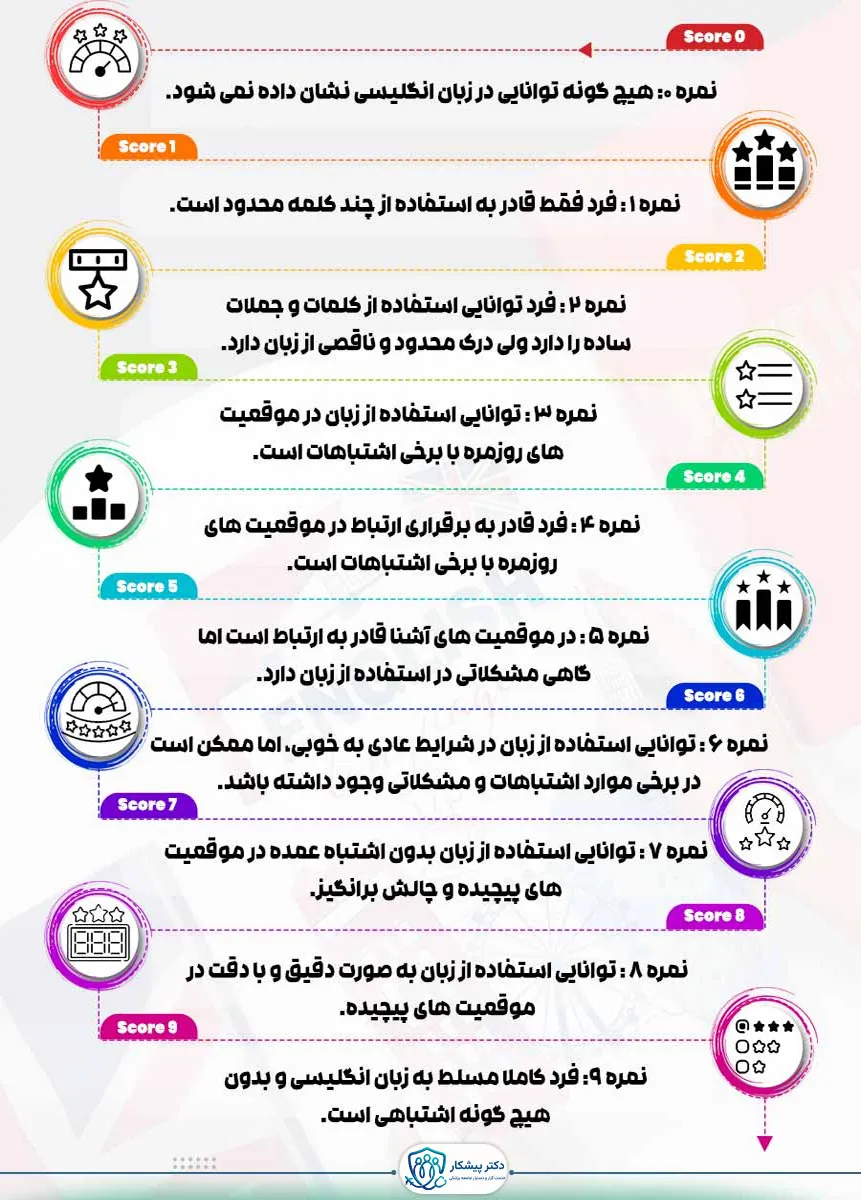 هر بخش از آزمون (Listening، Reading، Writing، Speaking) به صورت جداگانه نمرهدهی میشود و این نمرات از ۰ تا ۹ به شکل زیر ارزیابی میشوند: