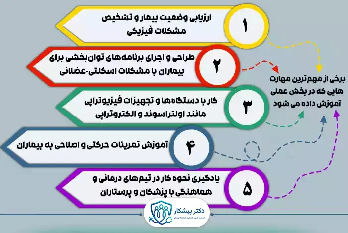 • مهارت‌های قابل یادگیری: روش‌های درمان فیزیکی، ماساژ درمانی، تمرینات حرکتی، ارزیابی و بهبود عملکرد عضلانی