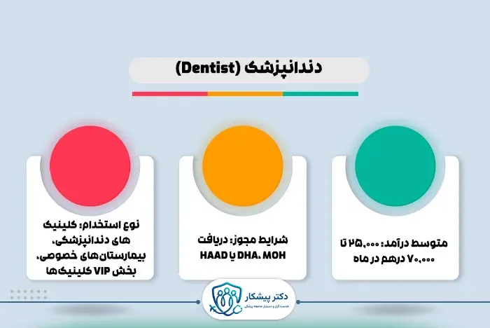 دندانپزشکان به دلیل تقاضای بالای خدمات زیبایی و درمانی در دبی، درآمد بسیار بالایی دارند. متخصصان ارتودنسی و ایمپلنتولوژی بیشترین درآمد را در این حوزه کسب میکنند.